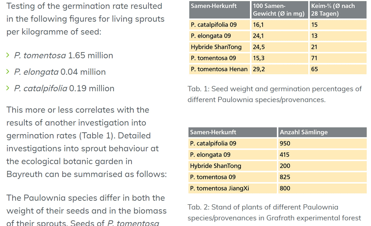 Les graines de paulownias hybrides peuvent être transportées très loin par le vent, mais elles ont besoin d'une humidité minimale de 90 % et d'une température constante de 26 degrés C pendant 2 semaines pour germer, alors que les graines de